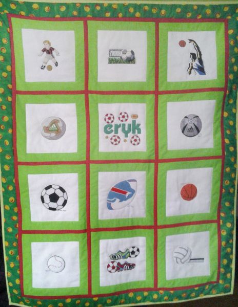 pełne haftowanych piłek. Są tam różne piłki, ale dominują te do gry w piłkę nożną.