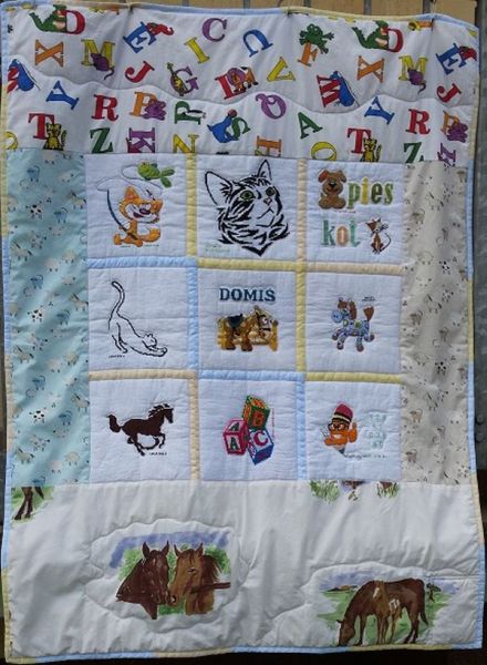 się literek, więc na kołderce s± literki. Domi¶ lubi zwierz±tka, więc i one znalazły