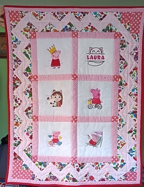 Laura uwielbia Świnkę Peppę oraz koci domek Gabi i właśnie takie kwadraciki ciocie wyhaftowały.