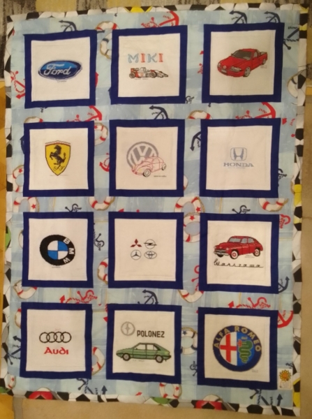 Powstał samochodowy patchwork ze wspaniałymi haftami samochodów i znaczków marek samochodowych. Kołderka jest taka uporządkowana i bardzo męska i bardzo spodobała się Mikołajowi.