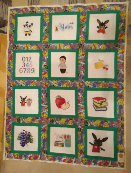 Wyhaftowane kwadraciki są przeróżne: warzywa i owoce, książki, liczby, Bing i Sula. Kołderka jest kolorowa i taka uporządkowana.