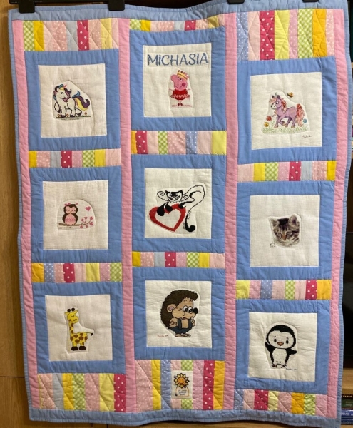 Kotki, jednorożce, sowa, pingwinek, świnka Peppa to ulubione zwierzątka wyhaftowane przez kołderkowe ciocie dla dzielnej Michasi.