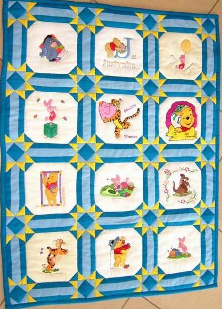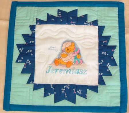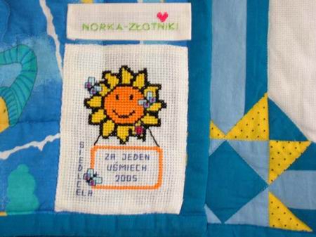 "Zgłosiłam się do szycia kołderki,ponieważ bardzo spodobał mi się "uśmiechowy" projekt. Dowiedziałam się o nim z "Wysokich obcasów" i w tym momencie byłam pewna, że muszę dołączyć do grona kołderkowych cioć. Parę lat temu zaraziłam się patchworkowym wirusem i maszyna do szycia stała się stałym elementem wystroju mojego mieszkania, a zszywanie "szmatek"jest tym,co mi sprawia wielką przyjemność. Kiedy dotarła do mnie przesyłka z kwadratami, zdałam sobie sprawę jak wielkim kredytem zaufania zostałam obdarzona. Na kołderce przeważa kolor niebieski, który jest ulubionym kolorem Justynki. O tym dowiedzałam się z bloga prowadzonego przez Nią. Zaglądam na niego regularnie. Justysia jest bardzo świetną,inteligentną dziewczynką. Często o niej myślę i mam