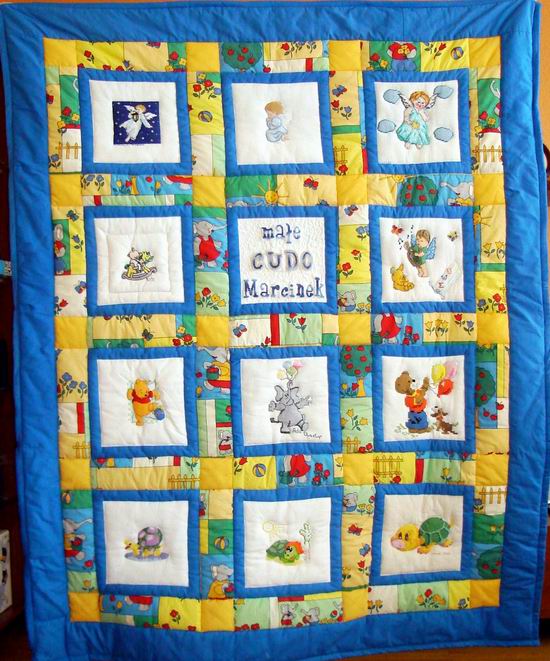Na kołderce, którą kołderkowe ciocie podarowały Marcinkowi, znalazły