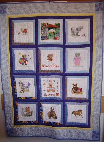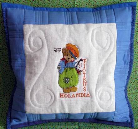 Po otrzymaniu kołderki Karolinka zapragnęła jeszcze poduszeczki do kompletu. Miałyśmy właśnie w zapasach poduszeczkę idealnie pasującą do kołderki - niebieską z uroczym misiem. Misia wyhaftowała Ipsi z Poznania a poduszeczkę uszyła Kasia z Opola.