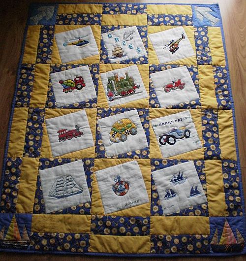 Kocikowa, czyli Zosia uszyła kołderkę , na której znalazły się obie pasje chłopca. Niebiesko żółta kolorystyka przypomina