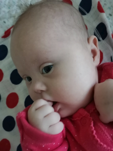 Zuzia jest bardzo wesołym i towarzyskim bobasem. Lubi kolory i lusterka. Kocha swoją butelkę i mleczunio, które w niej jest.