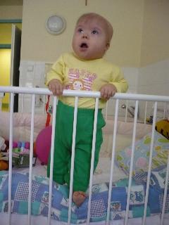 stawać w łóżeczku. Jest dziewczynką bardzo pogodną, śmieje się do wszystkich i