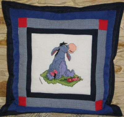 Kamil otrzymał poduchę z Kłapouchym wyszytym przez Joasię stworzyła