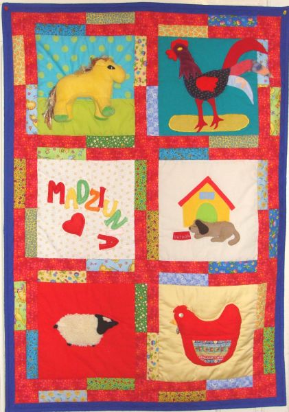 Na tej kołderce zamieszkały różne zwierzątka. Rano kogucik swoim pianiem obudzi