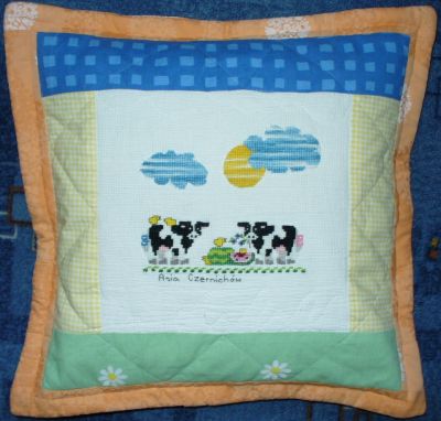 z wyszytymi przez Asię z Czernichowa krówkami na łące.