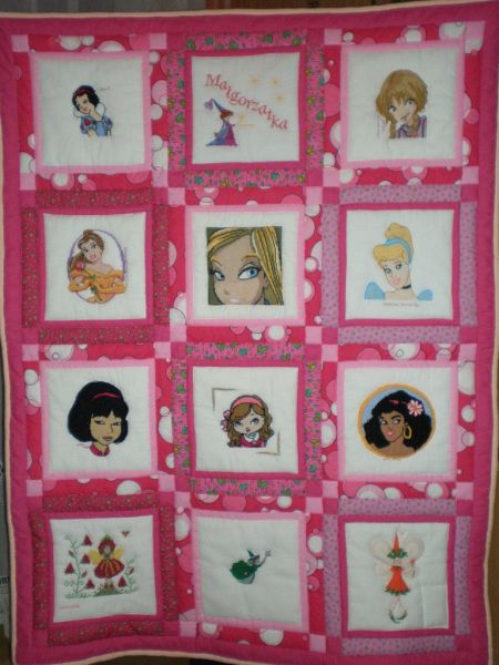 A że w różowym do twarzy jest i brunetkom i blondynkom, to na kołderce zjawiły się w roli modelek Kopciuszek i Esmeralda, Bella z modną fryzurą i Śnieżka o mlecznej cerze.