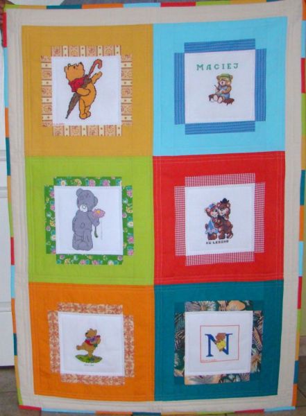 Ze względu na chore oczki wykorzystała soczyste i jaskrawe barwy jako tło dla haftowanych kwadracików z wesołymi misiami. Kubu¶ Puchatek znalazł nowych przyjaciół, z którymi chętnie