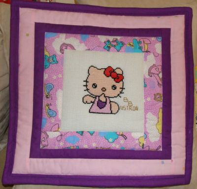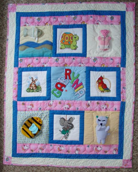 obok paluszkowych zwierzątek znalazły się haftowane kwadraty. Różowy miś schował