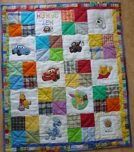uszycia kołderki z bajkowymi postaciami. Pocięła i pozszywała kolorowe materiały