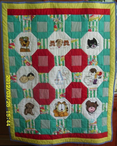 Zielono-czerwony patchwork pięknie eksponuje kwadraciki z haftami. A dużo się tu
