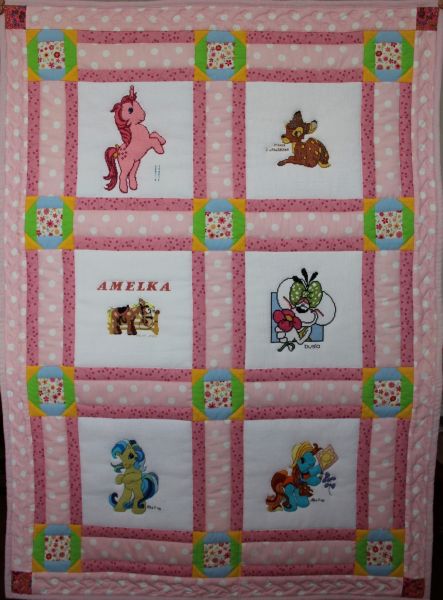 słodką różową kołderkę. Na kwadracikach wyszyte są ulubione przez Amelkę Kucyki Pony