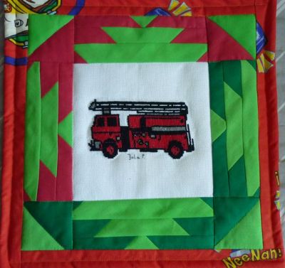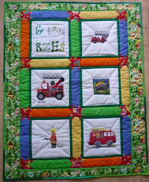 Na kołderce znalazły się wyszywane wozy strażackie z rozsuwanymi drabinami i
