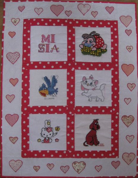 Serduszka na kołderce aż pulsują i ozdabiają przepiękne hafty. Jest tu biały kotek
