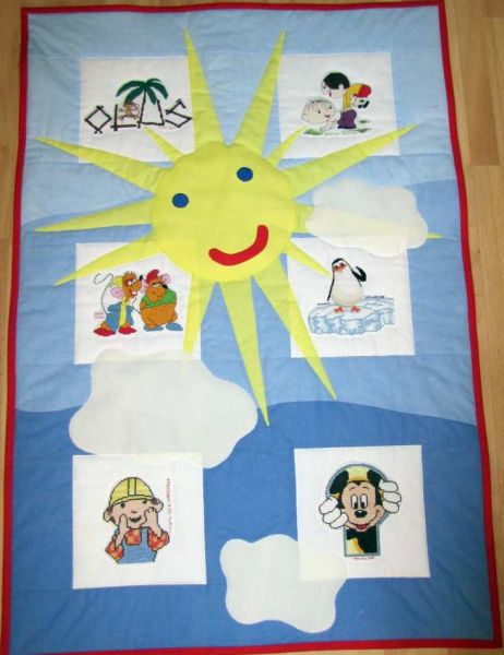 Kołderka ma słoneczko i chmury, a pośród nich są ciekawe hafty. Jest tu bawiąca