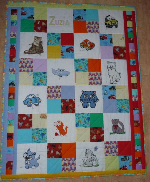 Zuzia lubi kotki i różne kotki zagościły na kołderce. Ale samochody też są pasją