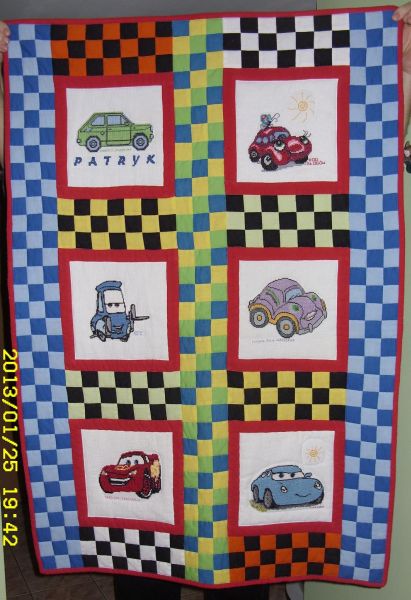 Jest tu ZigZag McQueen, Sally i Guido. Kołderka spodobała się miłośnikowi samochodów.