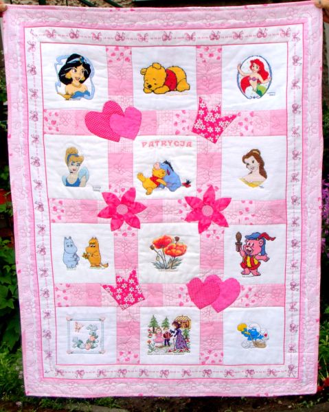 W różowe rameczki oprawiła hafty z ulubionymi bohaterami bajek. Na kołderce Patrycja