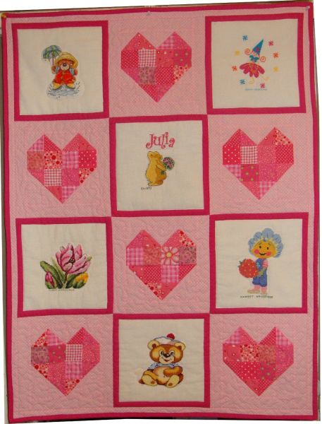hafty wplotła serduszka patchworkowe, całość jest słodko różowa. Na kołderce