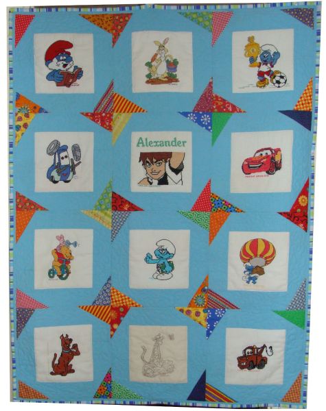 Pomiędzy haftami z motywami z ulubionych bajek chłopca wplotła kolorowe wiatraczki.