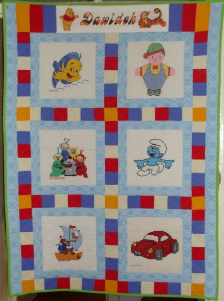 oprawę dla ślicznych haftowanych obrazków. Na kołderce wszyscy uśmiechają się do