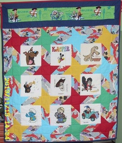 Także na materiałach wykorzystanych do uszycia patchworku są motywy bajkowe.