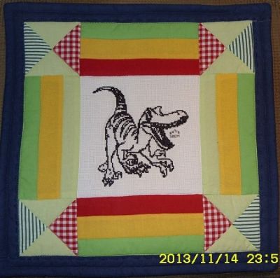chłopca. Brat otrzymał poduchę z dinozaurem wykonaną również przez