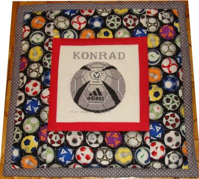 z piłką wyhaftowaną przez Halinę z Jasła a