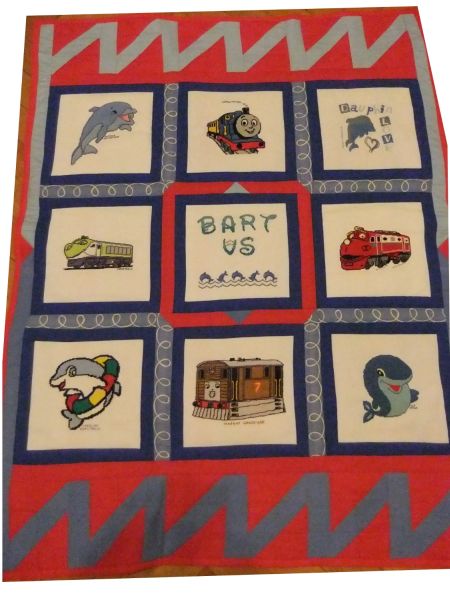 jest miłośnikiem pociągów, więc one zagościły na kołderce. Lubi też bardzo delfiny,
