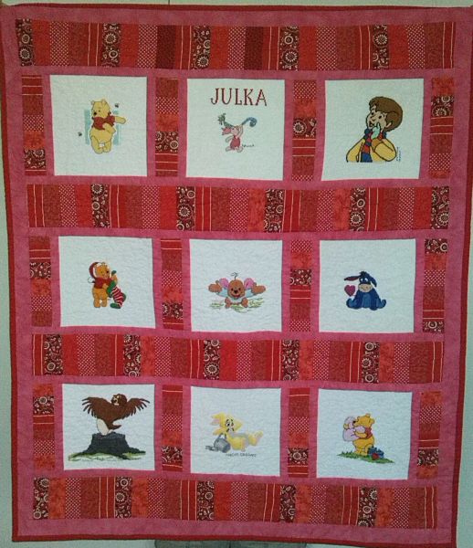 Krzyś oprowadzi Julkę po Stumilowym Lesie. Odwiedzą Kubusia Puchatka, Prosiaczka, Kłapouchego, Królika, Sowę i Maleństwo. To jest bardzo śliczna kołderka.