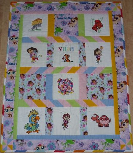 Na kwadracikach oraz tkaninach zagościły zwierzaki i wesoła Dora podróżniczka.
