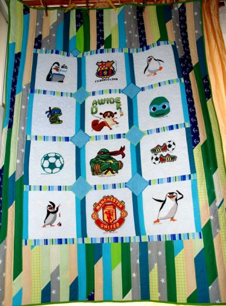 w paski, pozszywała tworząc fantazyjne obramowanie do haftów. Powstała piękna kołderka,
