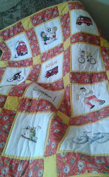 Na kołderce nie mogło zabraknąć wozów strażackich. Kołderka uszyta jest z materiału z