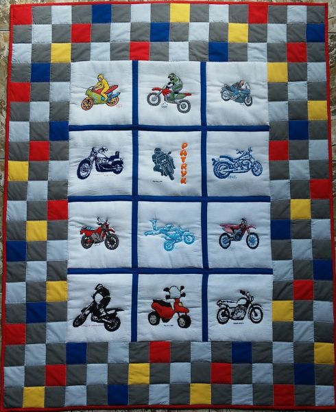 kołderkę pełną motorów. Małe kwadraciki zszywała żmudnie ciocia
