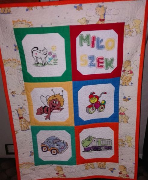 Na kwadracikach wyszyte zostały różnorodne motywy dla maluszka - są pojazdy,