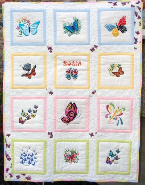 Na kwadratach przysiadły haftowane piękne, kolorowe motyle.