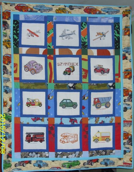 Są wyszyte samoloty, ciężarówki, samochody, a wszystko obszyte ramką z motywem klasyków