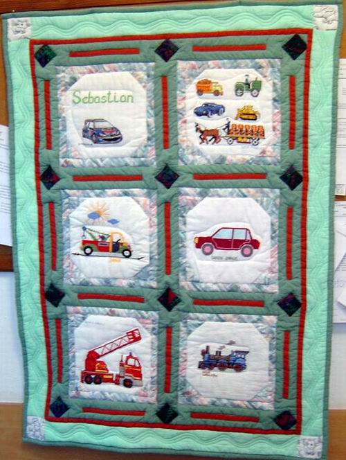 pojazdów. Na tej kołderce znalazły się kwadraciki wyhaftowane