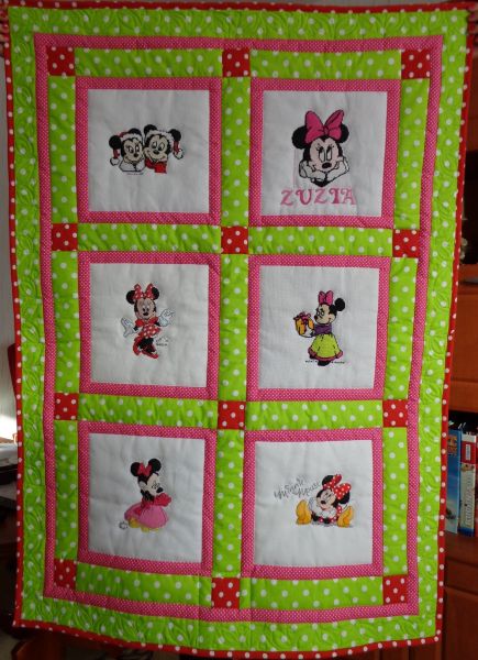 Ciocie wyszyły ulubioną Myszkę Minni. Ramki do haftów powstały z tkanin w kropeczki.