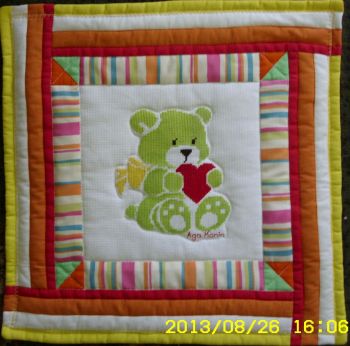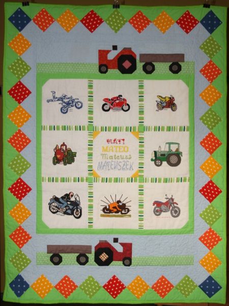 Mateusz bardzo lubi motory i traktory, więc kołderkowe cioteczki wyszyły kwadraty.