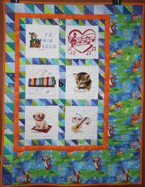 Chłopiec lubi słuchać muzyki, więc na kołderce zagościły instrumenty muzyczne.