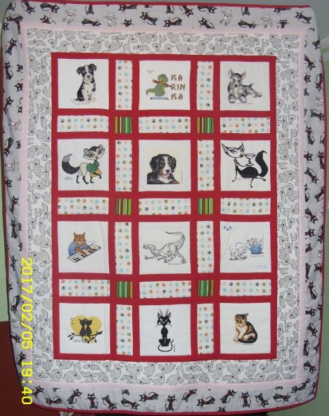 zwierzęta. Na kołderce zamieszkały wyszywane kociaki, psy i dinozaury.