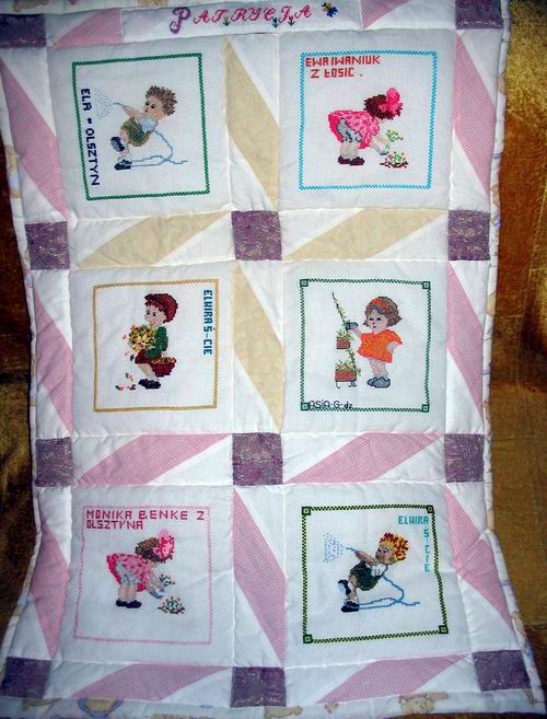 Szyldzik z imieniem dziewczynki wyszyła i przyszyła do kołderki Ela z Tarnowa.
