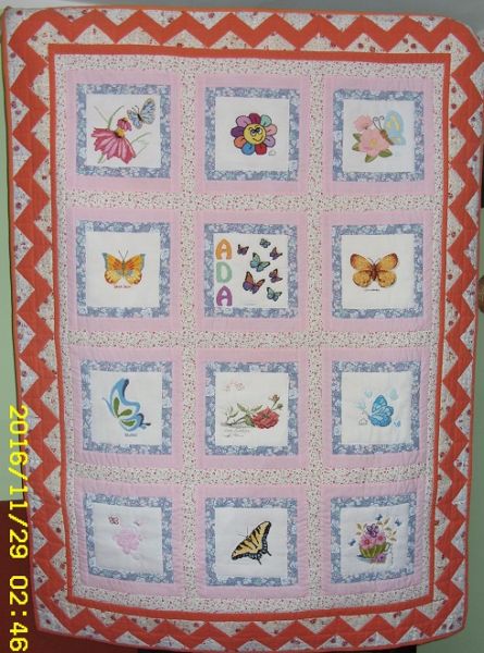 Kołderka jest różowa a motyle na niej wesoło fruwają.
