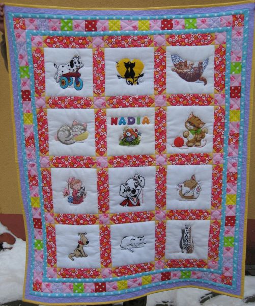 Dziewczynka bardzo lubi pieski i kotki, więc to one znalazły się na kołderce.